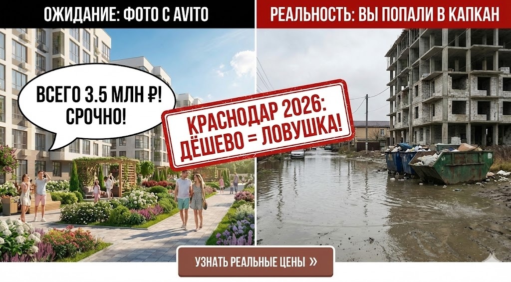 Вместо уютного двора — грязь и машины, припаркованные на головах друг у друга. Вместо свежего фасада — дом, который выглядит уставшим уже через год после сдачи. В 2026 году рынок Краснодара жесток. Правило одно: Если это дешево — значит, с этим что-то не так.