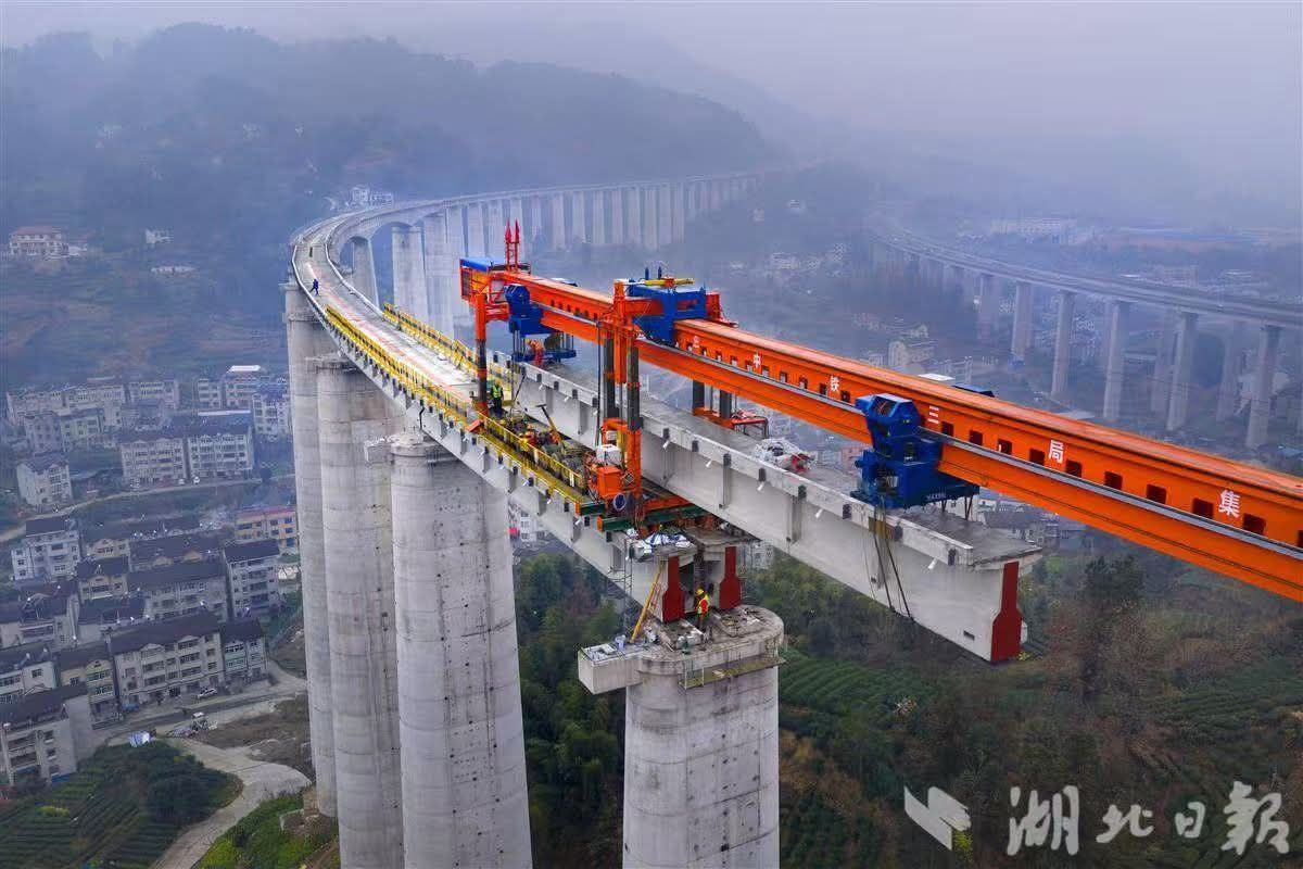 Рубрика строительство мостов. Объект: Железная дорога протяженностью 39,6 км (Южный вокзал Ичан с портом Маопин) в провинции Цзыгуй - монтаж балок пролетного строения эстакады консольно-шлюзовым монтажным агрегатом. 4 января 2026