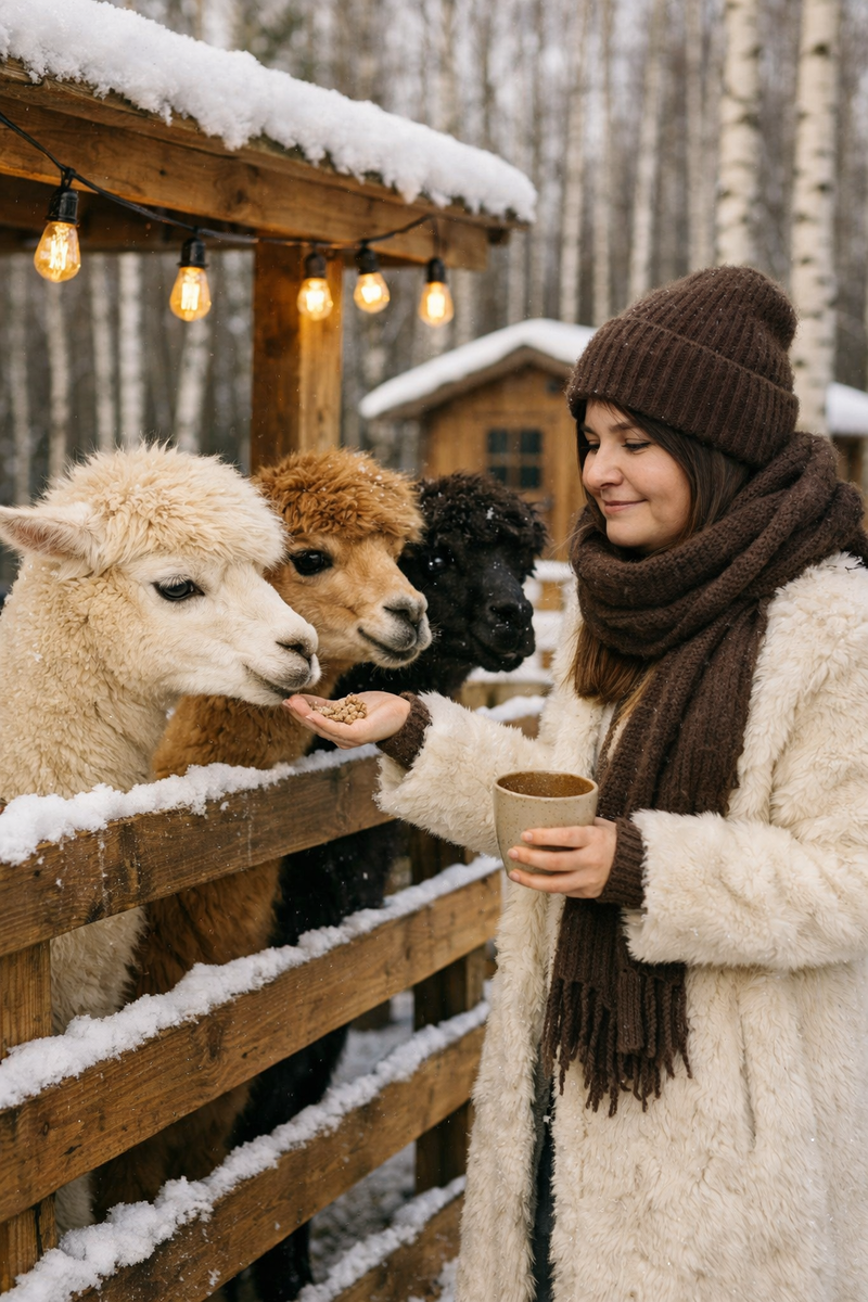 Фотореалистичная, вертикальная сцена 2:3, дневной зимний парк с берёзовой рощей на заднем плане и деревянным загоном: девушка, не меняй черты лица в длинном белом пушистом меховом пальто, тёмно-коричневом шерстяном шарфе коричневой вязаной шапке кормит лам (альпак) через деревянный забор; она держит