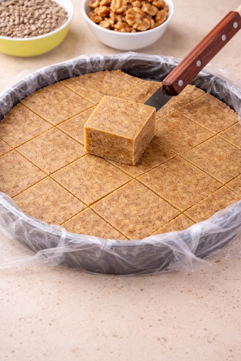 Плотно утрамбуйте массу в форму под грузом и дайте полностью остыть и затвердеть в холодильнике.