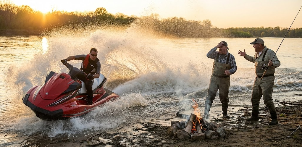 Вдоль берега на новеньком мощном гидроцикле летел парень лет 30. Увидев нас, он не сбавил ход, а наоборот — дал газу и заложил крутой вираж прямо у нашего лагеря.