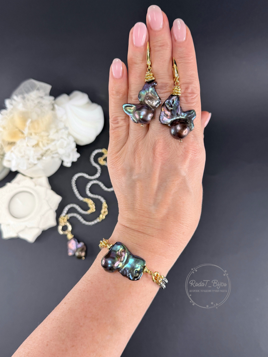 Здесь правит бал крупный черный барочный жемчуг роскошно причудливых форм. Каждая жемчужина словно павлинье перо: в темном перламутре таятся глубокие изумрудные, желтые, синие и фиолетовые переливы.