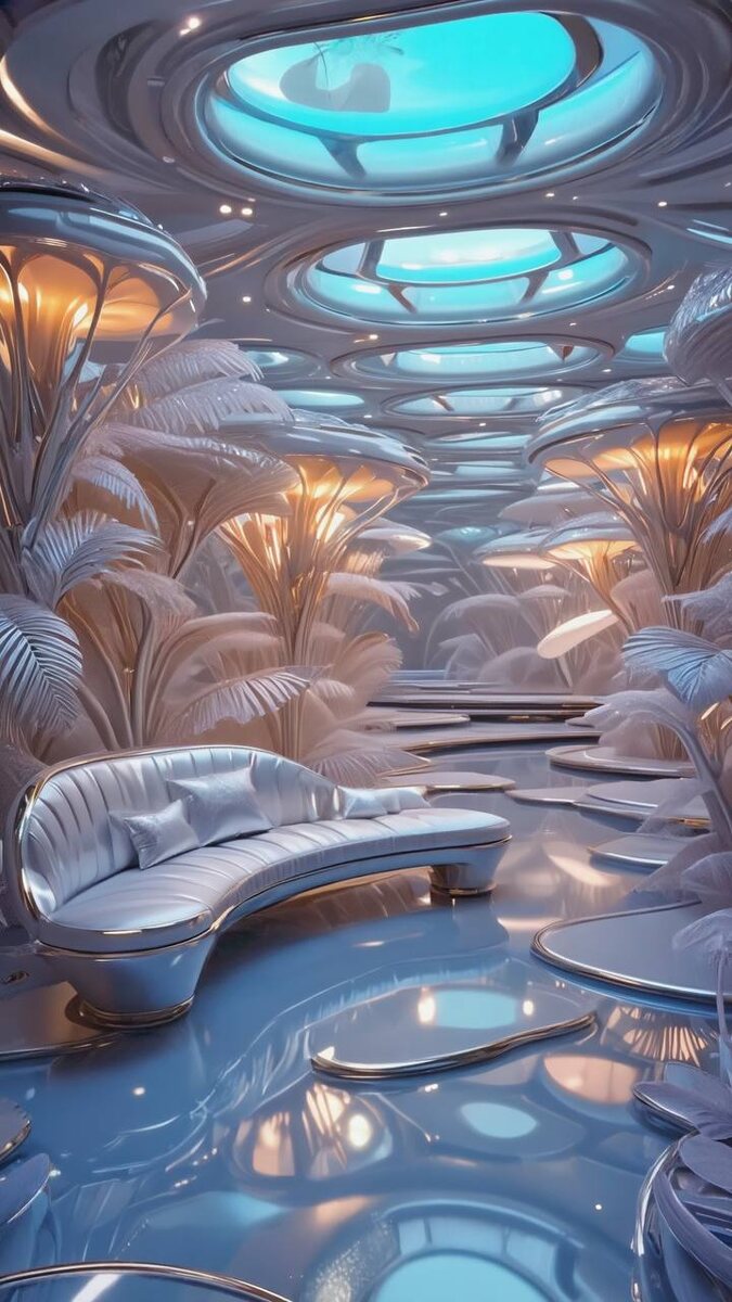 😊😊😊😊😊⬇️ Один промт ⤵️ 4 фото. Runaway ultra realistic 3D render, vertical frame, --ar 9:16, cozy seating area inside the ship’s botanical garden, smooth silver-white benches and tables integrated into the structure, camera close to one bench where alien plants grow through designed openings: flowers with multiple concentric rings of petals, semi-transparent, veins glowing soft cyan and orange, leaves like twisted ribbons with metallic sheen, in background more vegetation, small water channels with reflective surface, overhead mechanical light panels and support beams visible, high contrast, no haze, every plant and metal surface rendered in extreme detail Делала в нейросетях➡️ тут Обучение работе с нейросетями ➡️ тут