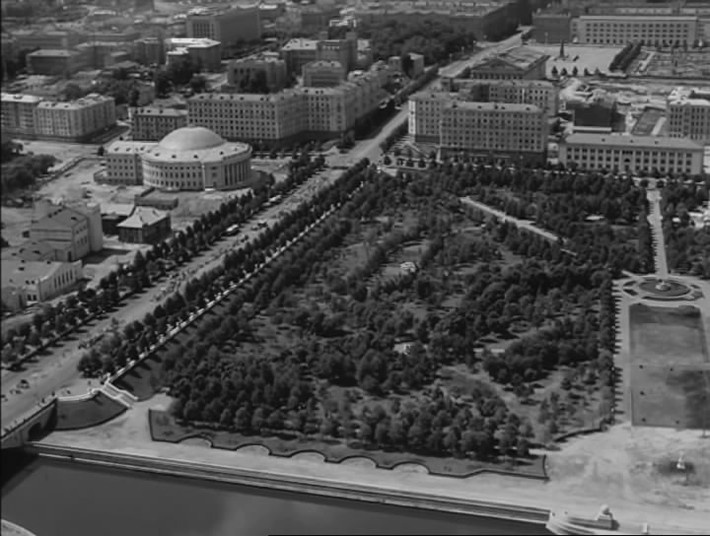 Конечно, в картинах 1950–1960-х годов «Наши соседи» (1957), «Любовью надо дорожить» (1959) и в десятках других художники-постановщики, операторы, режиссеры не уставали восхищаться заново отстроенным городом, его центральным проспектом. Запечатлевали эти места с вертолетов, с только что установленной телевизионной вышки на улице Коммунистической. Не забывали и о домах, просторных дворах поселков для работников автомобильного, тракторного, велозавода.