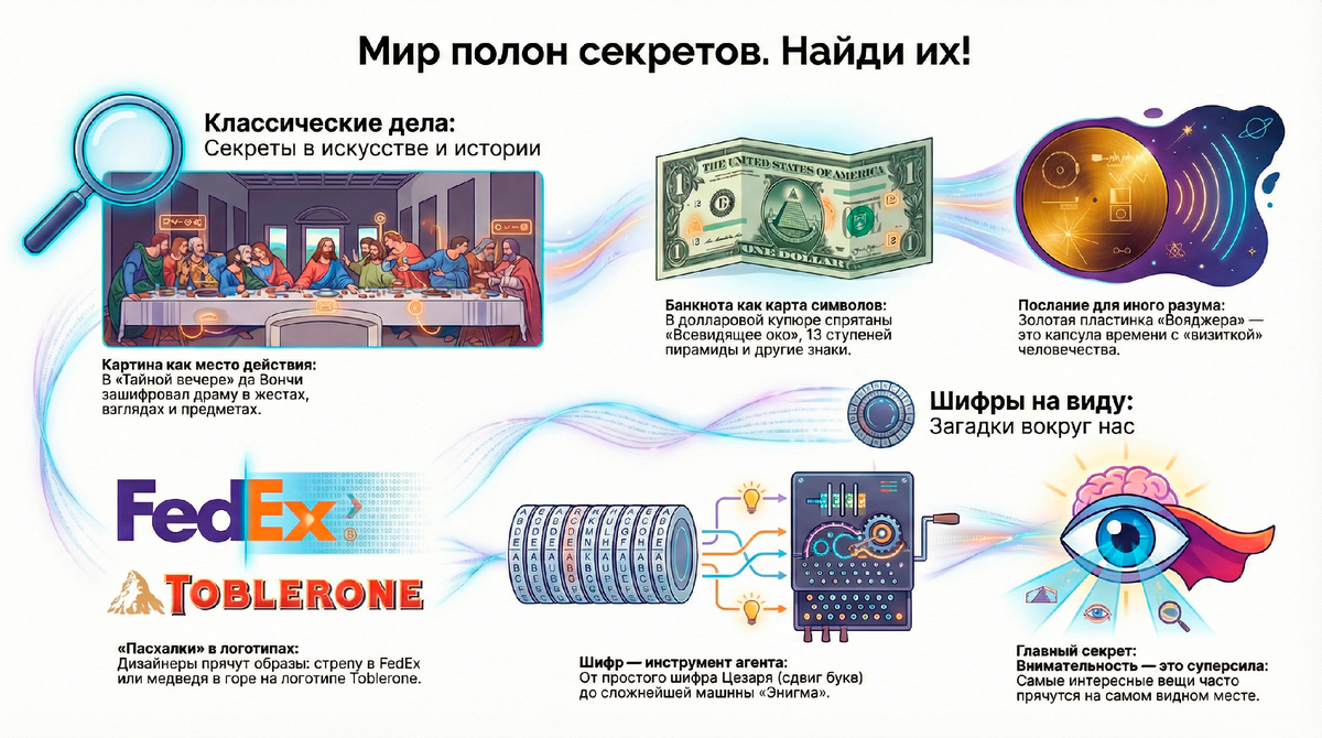 Всем добрый день! С этого момента вы — не просто школьники, вы — новобранцы сверхсекретного детективного агентства. Агентства, которое занимается самой увлекательной работой на свете: поиском тайных знаков, взломом шифров и расследованием скрытых посланий, которые окружают нас каждый день. Ваш первый рабочий день начинается прямо сейчас. Ваша суперсила — внимание. Готовы к первому заданию? Прежде чем искать, спросим: а зачем вообще что-то прятать? Представьте: вы пират и хотите, чтобы клад нашли только ваши друзья. Или вы учёный, который боится, что ваше открытие украдут. А может, вы художник и хотите оставить потомкам маленькую загадку. Или просто пошутить, как режиссёры, прячущие в фильмах «пасхалки». Сегодня мы будем искать все виды этих секретов! Первое дело! Перед вами не просто картина, а зашифрованный протокол последнего ужина. Леонардо да Винчи был гением-детективом. Он подбирал на улицах моделей для каждого апостола, чтобы передать их характер. Взгляните: молодой человек с
