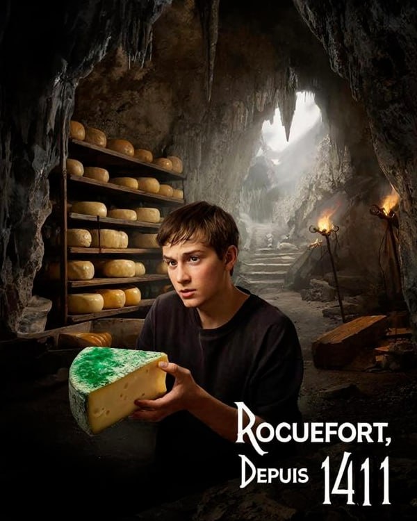 Как родился Рокфор.. В горах Руэрга, где ветра помнят времена драконов, жили пастухи, суровые и недоверчивые. Свои скудные сыры хранили в чреве пещер Комбалу, которые дышат леденящей сыростью и сквозняками. Однажды юный пастух, преследуя овцу, забрёл в хранилище и забыл краюху ржаного хлеба на головке сыра из овечьего молока. Спустя полный оборот луны он вернулся и обомлел: весь сыр был пронизан изумрудными прожилками, будто тронут рукой лесного духа. Ветер, что сквозил по известковым сводам пещер разнес споры плесени по всему хранилищу — тихую армию будущего вкуса. Поборов первый испуг, пастух всё же отломил уголок и замер: на языке взорвалась вселенная нового вкуса. Плесень, которую он счёл погибелью, стала благословением. Острые, пикантные нити изумрудной плесени пронизали сырную плоть, превратив привычную простоту в откровение. Так родился Рокфор, единственный сыр, чьё имя защищено с 1411 года королевским указом Карла VI. Молва о «сыре с душой дракона» прилетела и в аббатство.