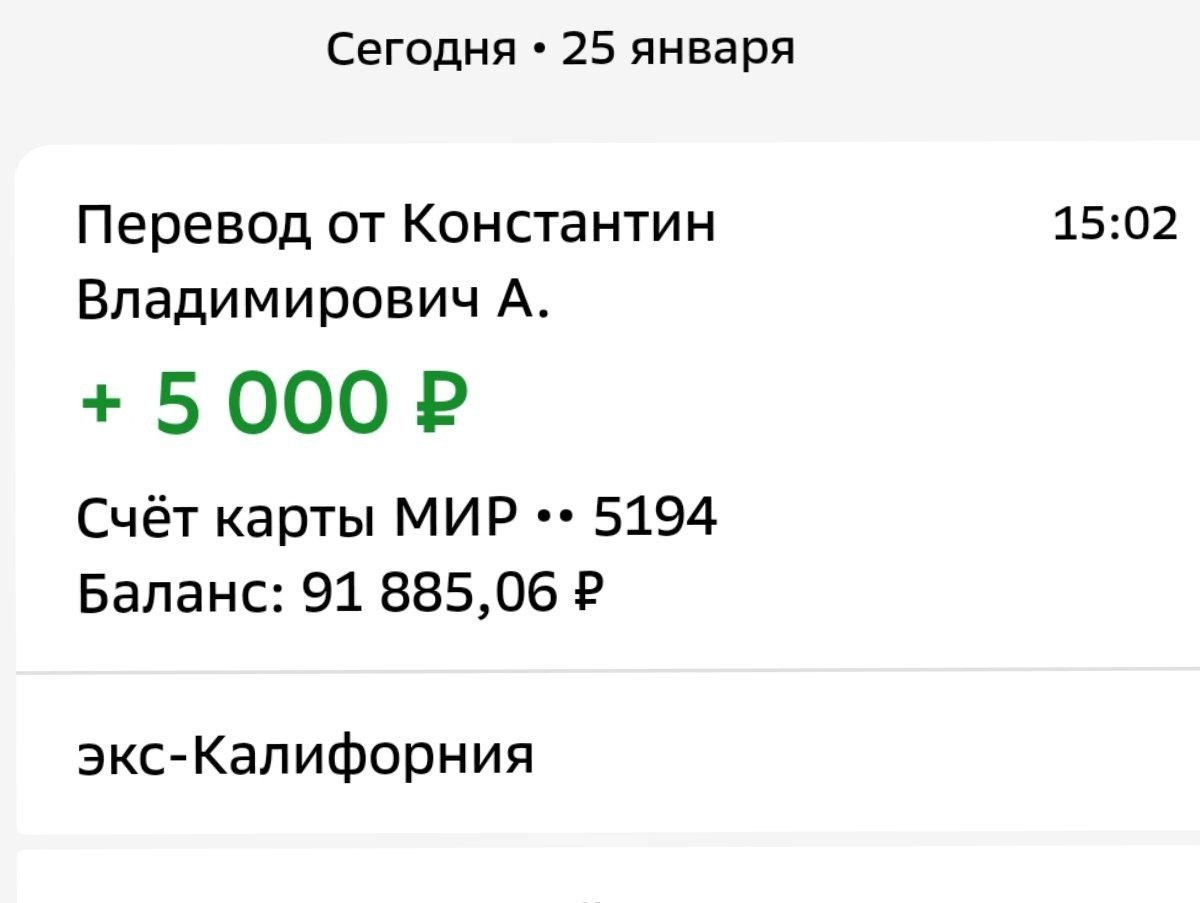 подписям "Калифорния" к переводам в поддержку наших войск🇷🇺🇷🇺 на СВО. Так вот уже с конца 2025 года он подписывает переводы "ЭКС-Калифорния". И история эта не про агентов ICE и не про неудавшуюся иммиграцию, а про спокойный патриотизм, когда, волею судеб оказавшись в США, добившись успеха и имея возможность остаться, семья приняла решение вернуться в Россию, в Осетию. И не просто из субъективной настольгии, но и по целому ряду объективных причин. И это в период колоссального исторического напряжения и неопределенности, во время боевых действий, которые ведёт наша страна, подвергаясь ударам противника, это с учётом того, что территория США уж точно, как впрочем и всегда, остаётся вдали от всех мировых конфликтов. И всë же Константин Владимирович и его семья предпочли Россию, Осетию.