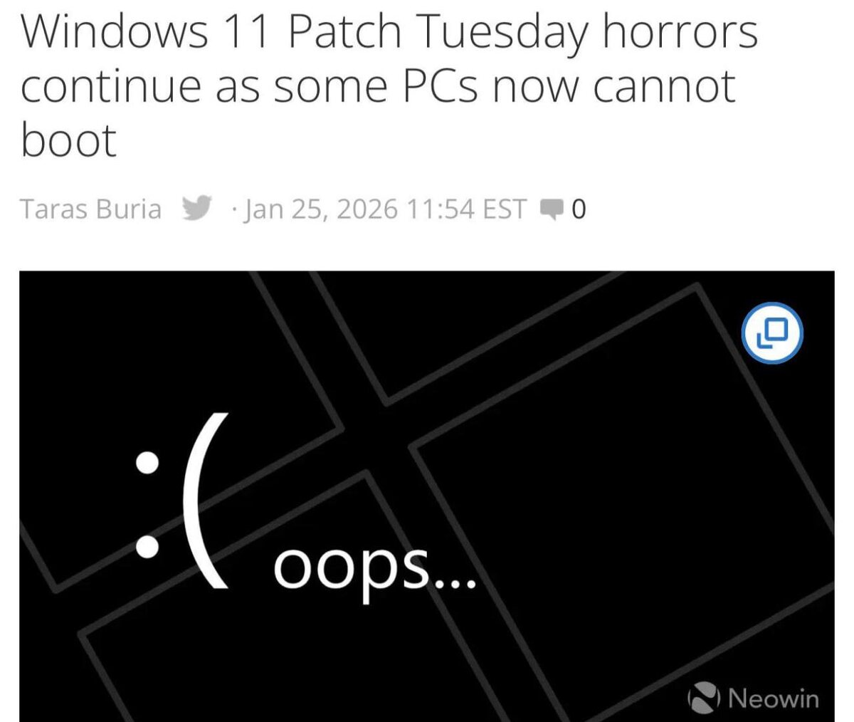После установки патча KB5074109 и связанных с ним апдейтов ПК перестают загружаться. Единственный способ восстановить работу — ручной откат системы. Предупреждаем близких, пусть не обновляются. CtrlAltDelights- подписаться