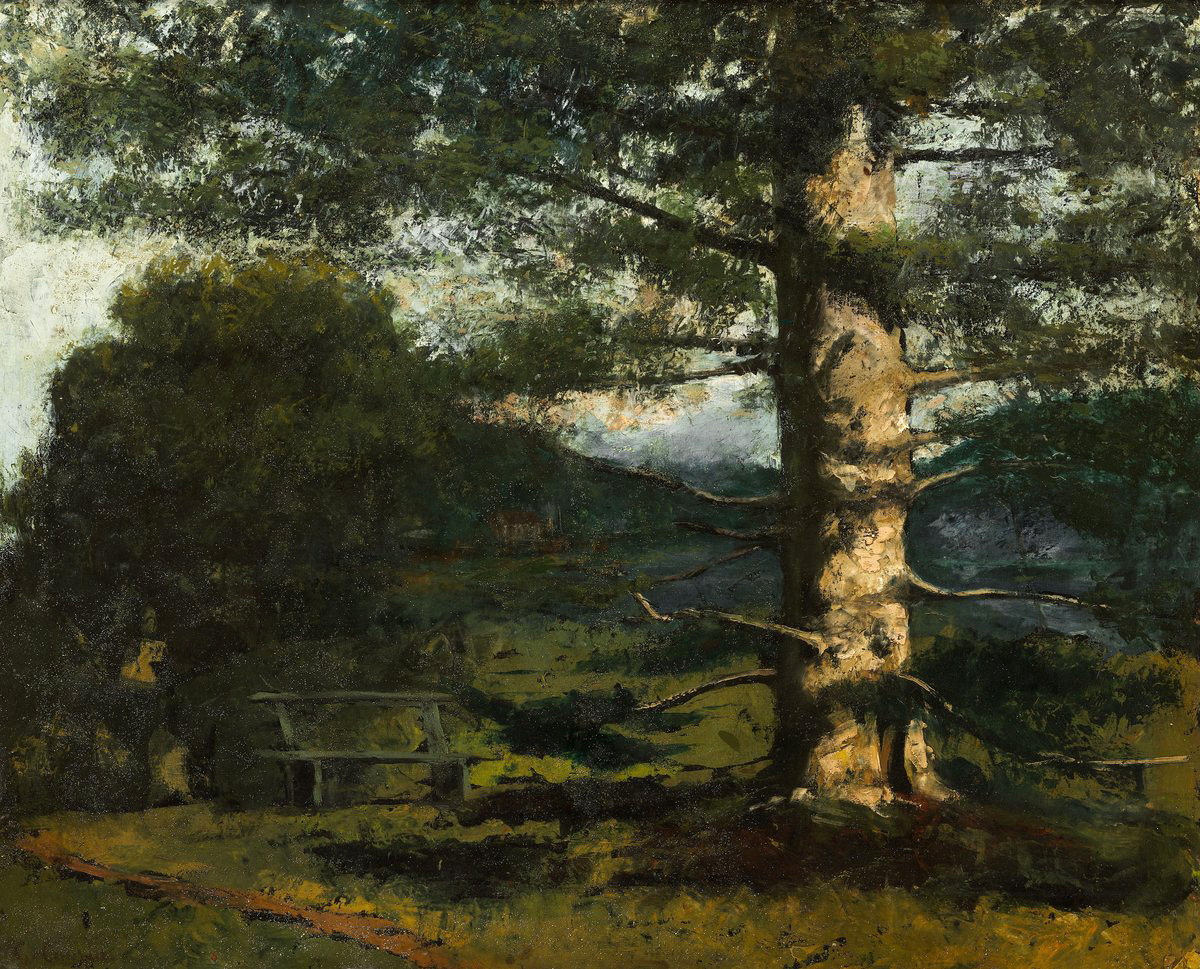 В письме от 17 октября 1868 года Гюстав Курбе (1819-1877) писал Жюлю Кастаньяри (1830–1888) из Орнана: В данный момент кажется, что Франция хочет возродить дух утраченного искусства. Почему? Потому что у нее есть идея энтузиазма и свободы самосовершенствования. Картина «Кедр в Отвиле», написанная Курбе во время одной из его поездок в Орнан в 1868 году, изначально датировалась 1874 годом и была опубликована в каталоге его работ, составленном Робертом Фернье. В 1978 году Стефани Полей, основываясь на стиле картины и биографических данных, изменил дату её создания на 1868 год. Действительно, художник провел осенние месяцы 1868 года в Орнане, своем родном городе, и несколько раз навещал семью своего друга-врача, жившего неподалеку. Отевиль расположен недалеко от Орнана, в живописных горах Юра. Культ пешего туризма, зародившийся в девятнадцатом веке, проявляется на картине Курбе, например, в скамейке, установленной муниципалитетом для того, чтобы туристы могли отдохнуть и насладиться откр