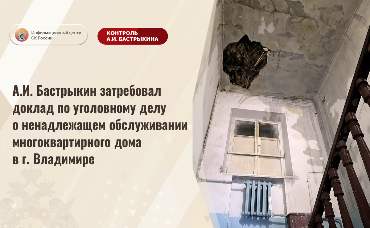 А.И. Бастрыкин затребовал доклад по уголовному делу о ненадлежащем обслуживании многоквартирного дома в г. Владимире В СМИ сообщается, что в январе текущего года в городе Владимире в результате прорыва системы отопления многоквартирного дома на улице Асаткина 1949 года постройки двое жильцов получили ожоги. Одному из пострадавших потребовалась медицинская помощь. Отмечается, что потолочные перекрытия и несущие конструкции здания разрушаются, однако мер к признанию его аварийным не принимается. В СУ СК России по Владимирской области возбуждено уголовное дело. Председатель Следственного комитета Российской Федерации Александр Иванович Бастрыкин затребовал у и.о. руководителя СУ СК России по Владимирской области Андрея Александровича Ялина доклад об установленных в ходе проведенных следственных действий обстоятельствах, а по завершении расследования уголовного дела – о его результатах. Исполнение поручения поставлено на контроль в центральном аппарате ведомства. #СледственныйКомитет #СКР