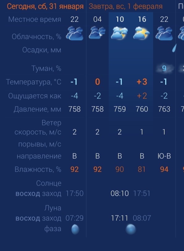 В воскресенье в Астраханской области будет довольно приятная погода. Ночью возможны туман и дождь. Утром температура в городе составит ‑1 градус. Днем потеплеет до +3. К вечеру температура вновь упадет до ‑1 градуса. Астраханцев ждет восточный ветер со скоростью 1–2 м/с. Атмосферное давление составит 760 мм рт. ст. Влажность воздуха выше нормы. На территории всего региона будет восточный ветер со скоростью 1 м/с. Температура воздуха ночью опустится до ‑1 градуса, а днем повысится до +5. Погодные приметы: Сообщение 1 февраля в Астраханской области ожидается потепление появились сначала на Астрахань.Ру последние новости региона.