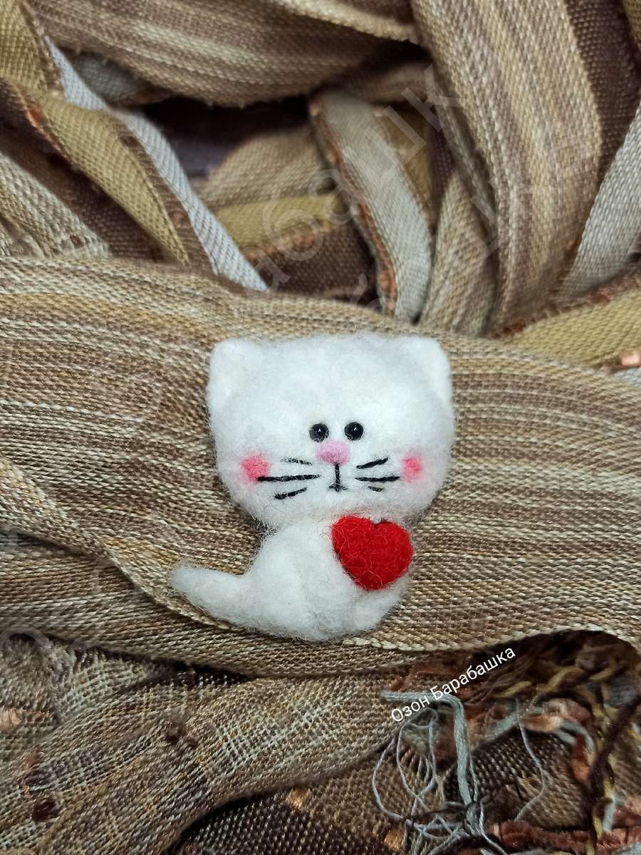 На днях добавила новую работу на Озоне, валяную брошь Белоснежного котика с сердечком. Придумывала два дня. Валяла, добавляла, убавляла, переделывала до тех пор, пока результат не устроил.