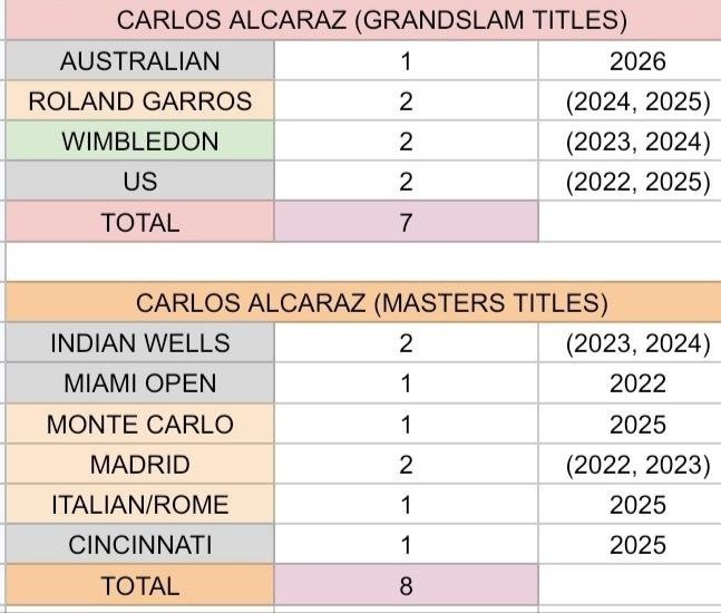 🎾🏆 После победы Карлоса Алькараса на Australian Open 2026, у него будет 15 крупных титулов: 🔥 8 турниров Grand Slam 🔥 15 Masters (ATP 1000) Судя по всему, он хорош на любом покрытии. А когда в 2030-х появится Masters на траве, он вполне может стать первым, кто его выиграет в современную эпоху! На фото статистика побед Карлоса Алькараса по турнирам Grand Slam: 🏆 Australian Open: 1 (2026) 🏆 Roland Garros: 2 (2024, 2025) 🏆 Wimbledon: 2 (2023, 2024) 🏆 US Open: 2 (2022, 2025) Всего: 7 И турниры серии Masters: 🏆 Indian Wells: 2 (2023, 2024) 🏆 Miami Open: 1 (2022) 🏆 Monte Carlo: 1 (2025) 🏆 Madrid: 2 (2022, 2023) 🏆 Italian Open/Rome: 1 (2025) 🏆 Cincinnati: 1 (2025) Подпишись на Эйс и точка