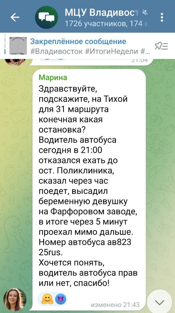 ? Водитель автобуса сегодня(01.02.26)в 21:00 отказался ехать до ост. Поликлиника, сказал через час поедет, высадил беременную девушку на Фарфоровом заводе, в итоге через 5 минут проехал мимо дальше. Номер автобуса ав823 25rus. Хочется понять, водитель автобуса прав или нет, спасибо! 📍@yurovmedia