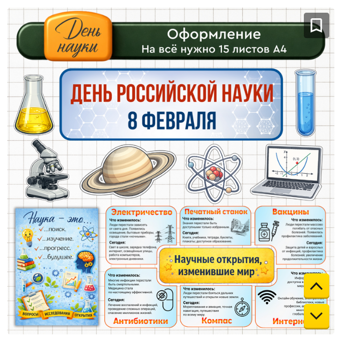 Комплект оформления ко Дню российской науки (8 февраля). Материал позволяет быстро и наглядно оформить кабинет, доску или стенд. Для всего оформления нужно 15 листов A4.