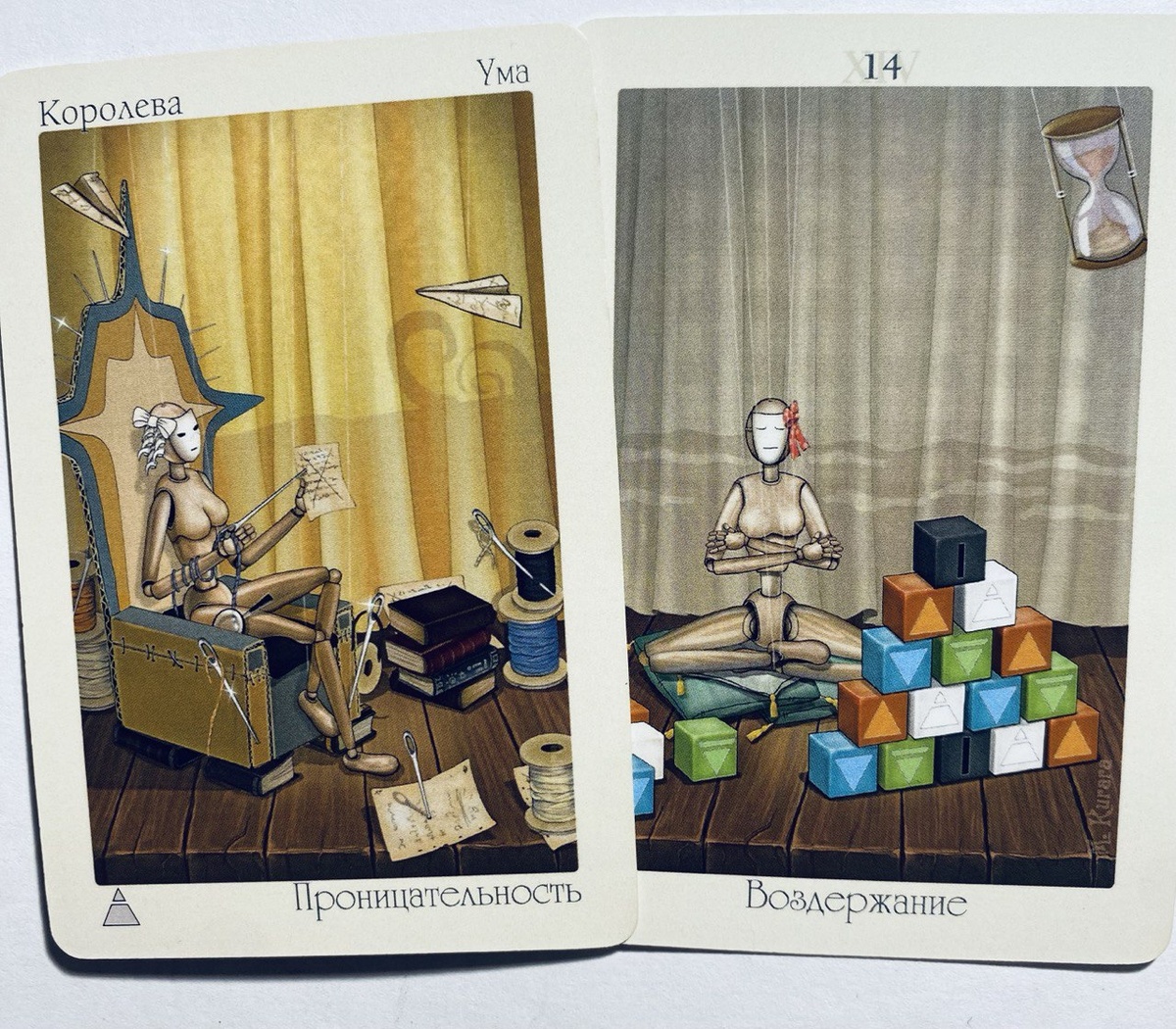 Она говорит сама себе: Эта карта про честность с собой: признать, что тебе тяжело и что так, как раньше, уже не хочется. Умеренность рядом с Королевой Мечей предлагает очень важный вариант: не устраивать революцию, а мягко перенастраивать свою жизнь.