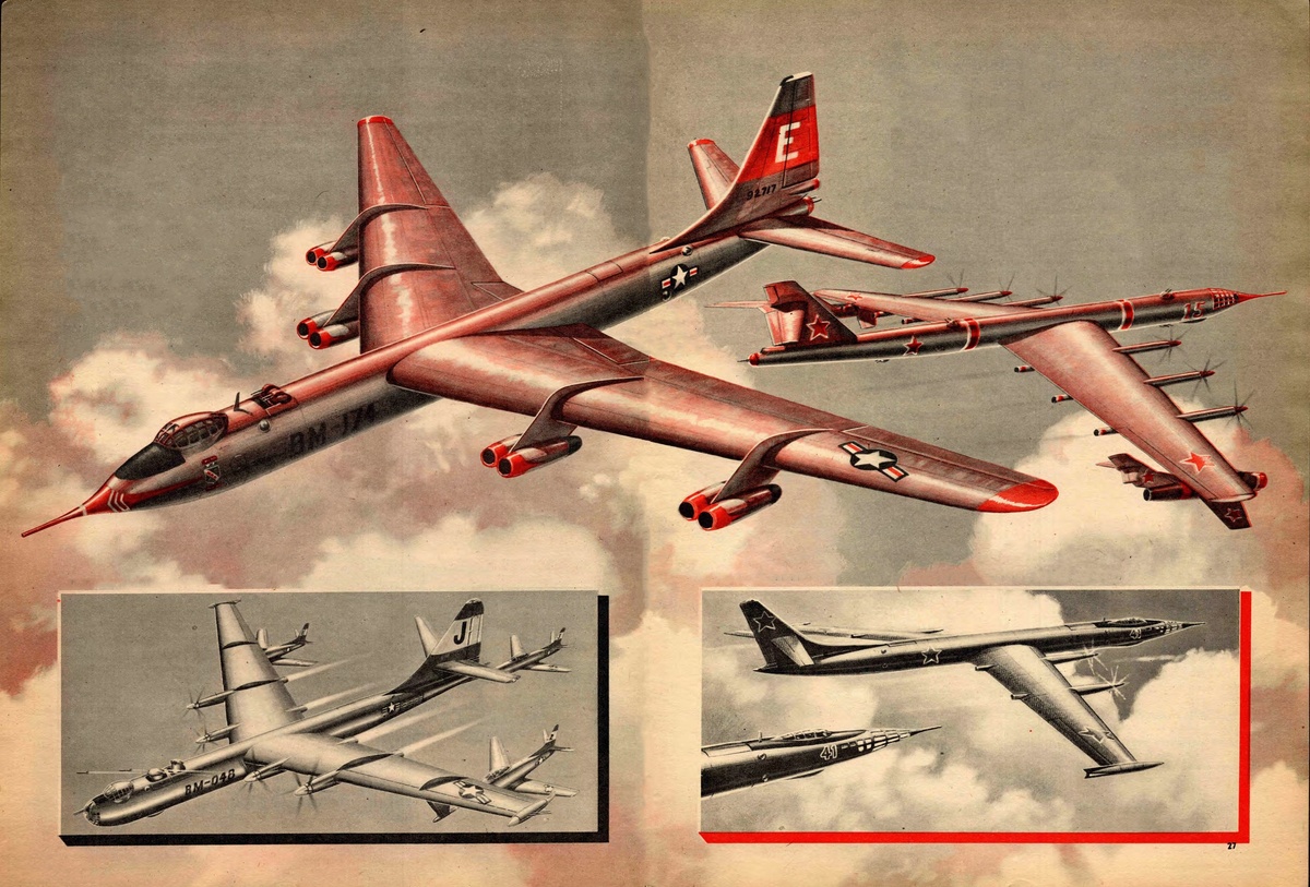 Небольшая, но интересная винтажная статья технофутуролога Фрэнка Тинсли из августовского 1952 года выпуска журнала «Air Trial», которая, думаю, заинтересует читателей и коллег. Совершенно секретные данные, проникшие за железный занавес, свидетельствуют о том, что русские отбросили свою бездеятельность в области стратегических бомбардировщиков и теперь разрабатывают большой бомбардировщик, сопоставимый по размерам с нашим B-36. Информация из множества источников позволяет нам воспроизвести ее ниже. Самолет оснащен шестью турбовинтовыми двигателями и является современным во всех отношениях – удар по некоторым скептикам, которые считали русских конструкторов слишком отсталыми для создания такого летательного аппарата. Также считается, что этот советский гигант поднимал в воздух истребители сопровождения. Данная концепция в течение долгого времени была засекреченной в нашей стране и лишь недавно было признано, что B-36 был самолетом-носителем истребителей F-84 Thunderjet. Два наших ответа
