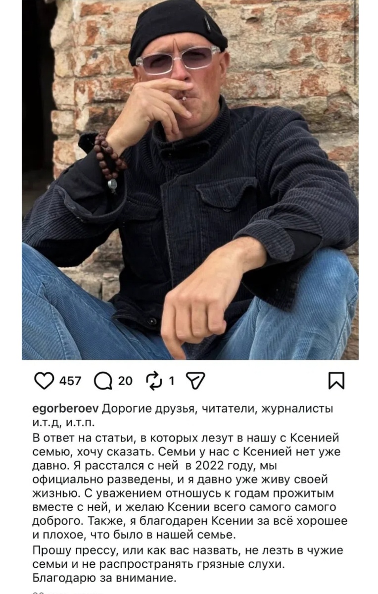 Егор Бероев прокомментировал свое расставание с Ксенией Алферовой. Сообщил, что они не вместе с 2022 года. Ксения Алферова - наследница актрисы Ирины Алферовой и приемная дочь Александра Абдулова. Ранее Егор и Ксения взяли опеку над больным ребенком. Он вырос, у нег