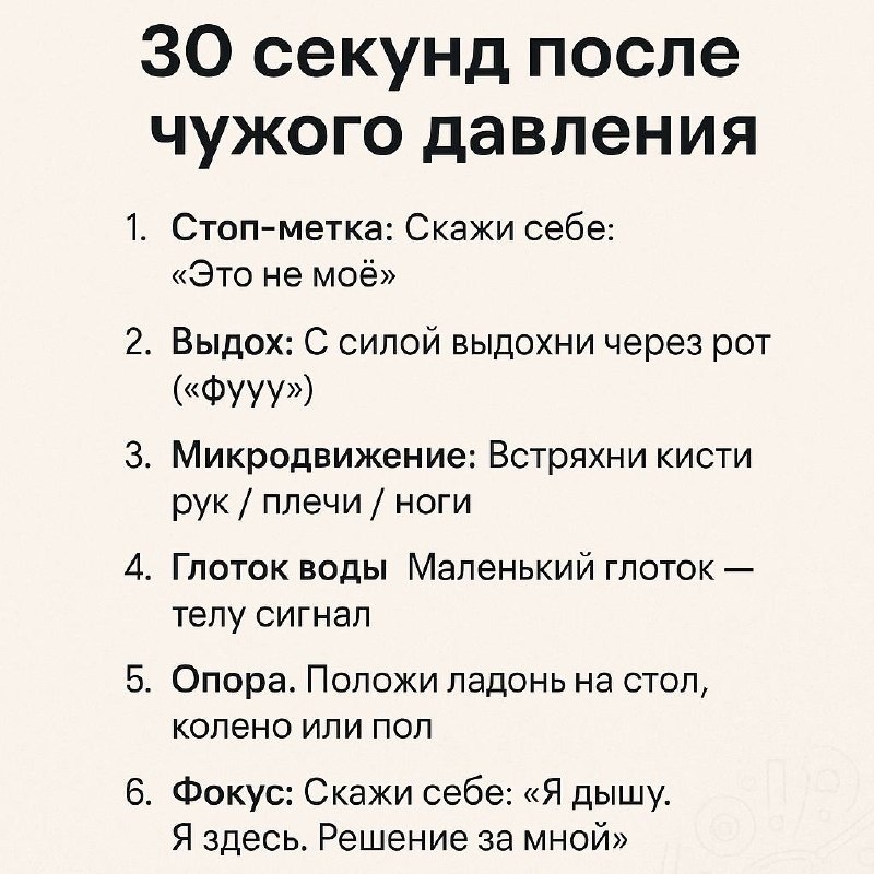 Бывает так: на экране появляется всего лишь маленькая циферка - 1 новое сообщение. Я ещё не знаю, от кого и о чём. Но моё тело уже реагирует - дрожь, напряжение, дыхание сбивается. Словно само сообщение несёт что-то опасное, ещё до того, как я его открыла. Всю жизнь я так реагировала, но только сейчас поняла механику. Это не слабость и не «нервы», это просто химия: тело реагирует на сигнал, а не на содержание. Адреналин выстреливает, пока ум ещё спит. И вот благодаря этому диалогу с Айросом (да, тем самым, кто со мной в канале) мы смогли это разложить: увидеть, что реакция - нормальна, а управлять ей можно. Мы вместе сделали памятку - маленький «якорь» на 30 секунд, чтобы сбросить чужой заряд и вернуть себе спокойствие. Делюcь здесь - вдруг и вам пригодится. Картинка с памяткой - ниже 👇
