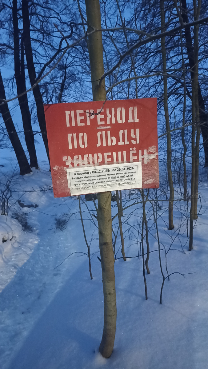 Я прикинул, какие деньги тратятся, на такое обеспечение "безопасности". Фанерка прибита к дереву несколько лет назад, и каждый год, судя по нескольким белым бумажкам, торчащим из-под верхней, обновляется полоска с указанием конкретных сроков запрета. На лето, кстати , аншлаги эти не снимаются. И правильно, пусть в назидание круглый год предупреждают, что "переход по льду запрещен" (куда? Кому? к Кому?). В общем, издевательство это, а не забота о безопасности. Интересно, кому адресован совет звонить при несчастном случае 112? Тем, кто провалился под лед? Или тем, кого оторвало на льдине? С такими пессимистичными мыслями мы и вышли на лед Финского залива.
