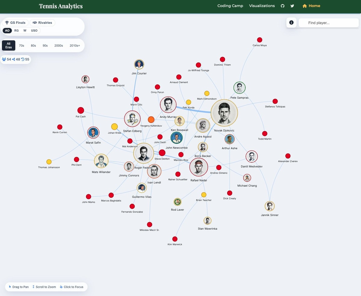 🎾 Автор реддита сделал интерактивную визуализацию финалов AO и предлагает поиграть с данными: * Размер нода Новака просто огромен 🤯 * У Энди Маррея 5 финалов и 0 побед 💔 * В 90-х доминировали Сампрас, Агасси и Курье * Род Лейвер связан только с финалом 1968 года * Всплывают имена, о которых вы могли забыть (Петр Корда) На графике можно приближать, отдалять, перетаскивать, кликать на игроков и фильтровать по эпохам. А что заметили вы? 🤔 [Ссылка на интерактивный граф](https://sorukumar.github.io/tennis-analytics/network/index.html?graph=australian_open) Подпишись на Эйс и точка