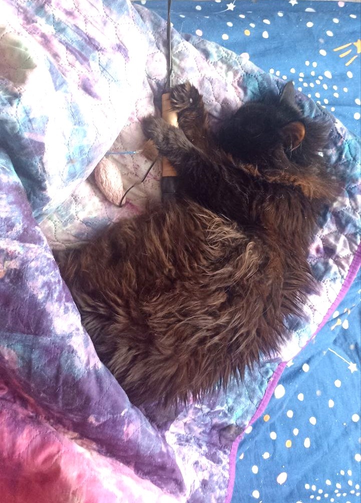 Известно, что во сне обычно человеку очень сложно осуществить какие-либо физические действия. Ну, там двинуть рукой-ногой. Оно и понятно, спишь обычно в постели, под одеялом, расслабленный. Да и сон, если это не кино голливудское, происходит упрощенно говоря - в голове, а не в руках и ногах. А тут вот со мной казус случился. Сижу после дня на рыбалке, набираю сообщение в Новостях с водоемов Питерского клуба рыбаков. Уставший, невыспавшийся. Набираю с ноутбука, который стоит рядом с кроватью на стуле. Удобно ж, когда живешь в студии, и пространство ограничено. Ну и лень конечно свою рояль играет. Меньше ходишь, больше отдыхаешь. В общем, буковки сообщения набрал, ищу фотки как загрузить, фотки то в телефоне, а сообщение в ноуте. Тут забирается ко мне "на ручки" кот. Черный, ласковый такой, мой, не чей-то, хороший такой котяра, и мешает процессу. Вот он на фото, настоящий рыбацкий кот, даже спит с удочкой. У котов есть чудное свойство , которое я называю умиляторство, и я конечно же с