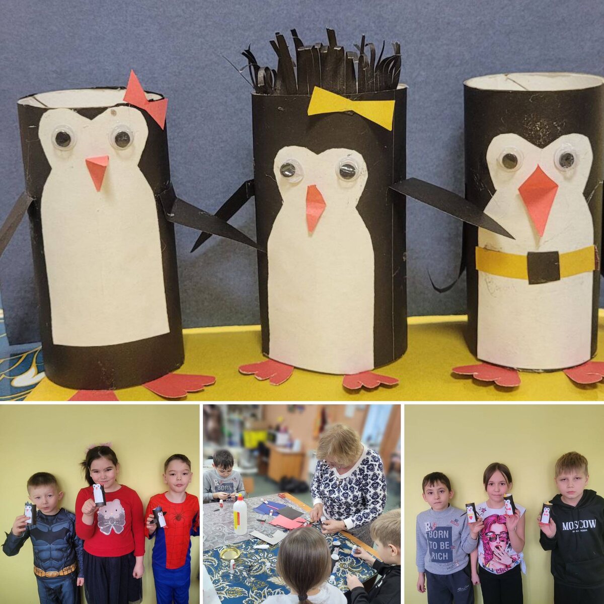 Пингвины — милые и забавные существа, которые завоевали симпатии людей по всему миру. Они стали популярными персонажами в мультфильмах и игрушках. Наши ребята решили сами создать пингвинов, используя обычные втулки. Для создания пингвинов из втулок нам понадобились: • Втулки • цветная бумага • Ножницы • Глазки (можно сделать из бумаги) Ребята начали с того, что обклеили втулку черный бумагой. Это тело пингвина. Следующим этапом дети приклеили на переднюю часть втулки белую бумагу (животик). На верхней части закрепили пластмассовые глазки и клюв. Сбоку ребята присоединили крылья, а внизу втулки приклеили красные лапки. Пингвины получились веселые, задорные, непохожие друг на друга. Ребятам работа очень понравилась. Занятие было не только веселым, но и познавательным.