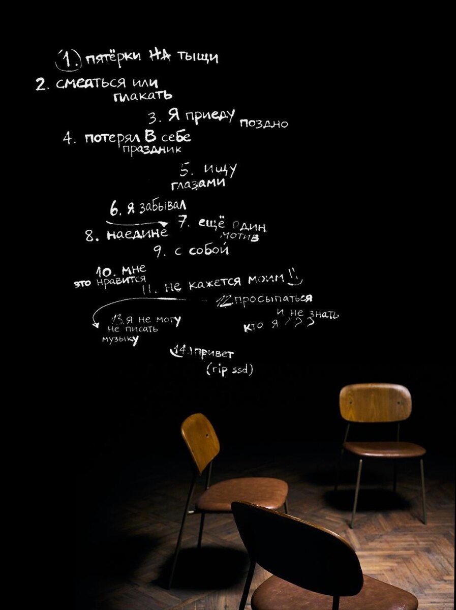 Треклист: 1. пятёрки на тыщи 2. смеяться или плакать 3. я приеду поздно 4. потерял в себе праздник 5. ищу глазами 6. я забывал 7. ещё один мотив 8. наедине 9. с собой 10. мне это нравится 11. не кажется моим 12. просыпаться и не знать кто я 13. я не могу не писать музыку 14. привет (rip ssd) @mainstreamusic