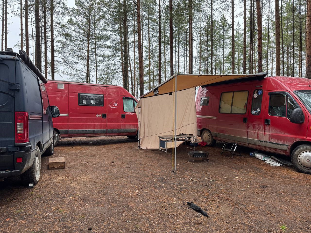 Нас вы уже знаете, поэтому перейду к следующим по старшинству. Это экипаж Дины и Дениса, которые ездят на почти таком же как у нас красном Дукато 244, только бывшим грузо-пассажирском. Потому экипаж их зовется "Красный саквояж". Они плюс-минус нашего с Леной возраста. А вот Катя и Вася, чуть помладше и машина у них короткий и низкий Дукато 4х4 синего цвета. Называются они "Поехавашие" и у них есть свой ТГ-канал.