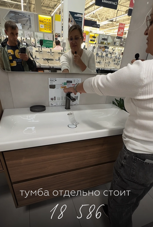 Вы когда-нибудь заходили в магазин и видели, как на ценнике пишут «комплект», а потом разбирают его на части и продают каждую отдельно? Я сегодня это увидела и посчитала. Тумба под раковину с зеркалом и смесителем. Выглядит стильно: дерево, белая столешница, чёрный кран. На ценнике написано: «комплект». Но если вы внимательно посмотрите там нет цены за комплект. Есть цена за каждую деталь. Тумба — 18 586 рублей.
