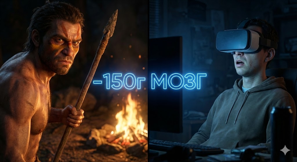 За последние 25 000 лет человеческий мозг потерял в весе в среднем 150 грамм. Мы привыкли думать, что эволюция — это движение вверх, к сверхразуму. Но антрополог Станислав Дробышевский и нейробиолог Владимир Алипов утверждают обратное: биологически мы стремительно деградируем. Парадокс: мы летим в космос и создаем ИИ, но наш личный «хардвар» становится слабее. Мы оказались в ловушке комфорта, где дорогой в обслуживании мозг больше не нужен для выживания. Как не превратиться в «овощ» раньше времени и почему проверка слуха важнее для интеллекта, чем чтение книг? Разбираем главные инсайты из беседы ученых. Вам кажется, что люди становятся умнее, потому что мы умеем пользоваться гаджетами и решать тесты IQ? Это иллюзия. Нейробиолог Владимир Алипов сравнивает наш интеллект с уборкой комнаты, где мусор заметают под ковер. Но когда «мусора» под ковром (накопленных ошибок и отсутствия реальной нагрузки) становится слишком много, ковер перестает справляться. Мы теряем способность выживать без и
