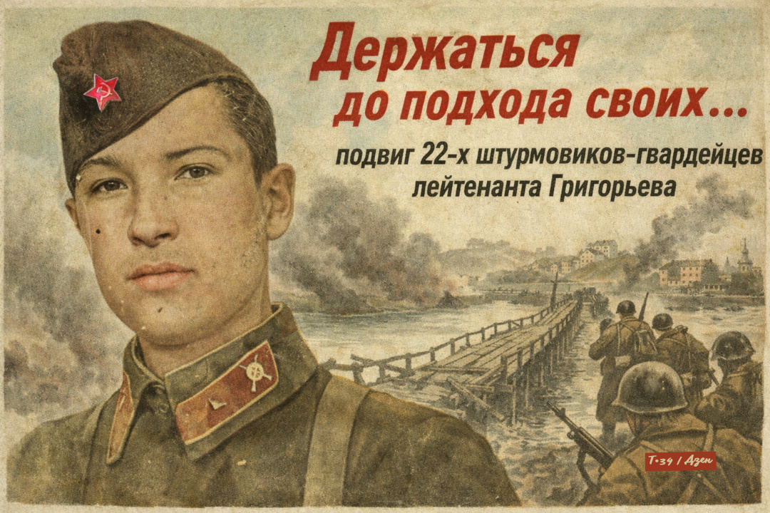 Для этого создали штурмовую группу из 8-й роты. Возглавил её гвардии лейтенант Александр Михайлович Григорьев. Под его началом было двадцать два гвардейца. Именно эти смельчаки первыми под огнём преодолели реку, захватили плацдарм на правом берегу и сумели закрепиться. Вслед за ними переправились две стрелковые роты, батальонная артиллерия, часть полковой и, согласно некоторым данным, два танка. Им и предстояло выдержать основной удар.