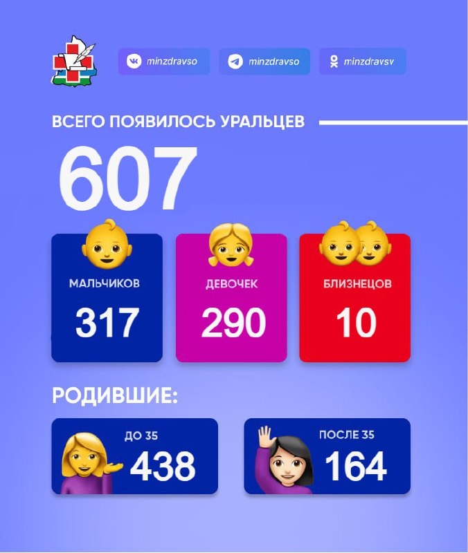 ! 🤱За прошедшую неделю в Свердловской области на свет появились 607 малышей: 💙 317 мальчиков и 290 девочек 💖, из них 5 пар близнецов! 438 мам родили до 35 лет. 164 мамочки родили после 35 лет. 👨👩👧👦Для одной свердловчанки это стали девятые по счету роды. 192 малыша стали вторыми детьми у своих мам. Охрана материнства и детства является важной составляющей ежедневной работы специалистов регионального Минздрава. Поздравляем! 💬Мы в MAX / 📱 Мы в ВК / 📱 Подпишись