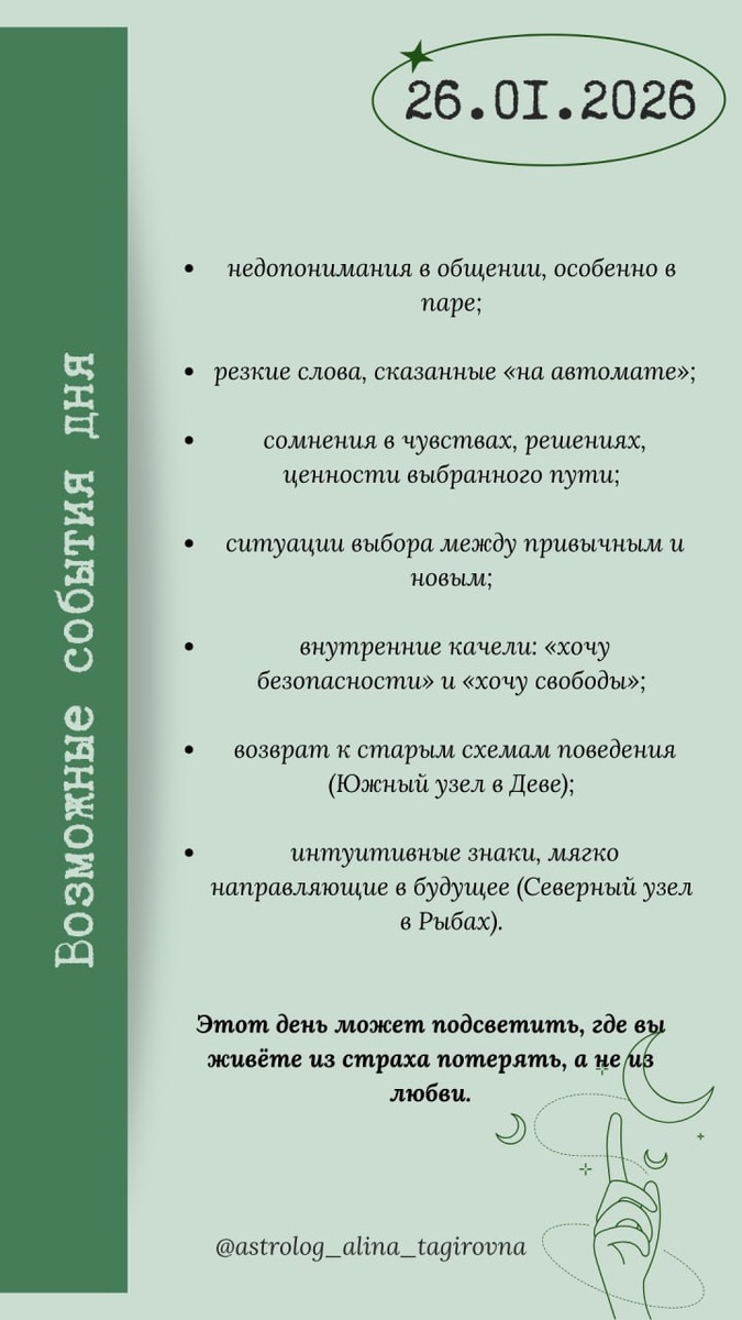 2️⃣6️⃣ января, понедельник В 10:30 начало 9️⃣-го Лунного дня Растущая Луна в знаке ♉️Телец Общая характеристика дня 9-й лунный день считается одним из самых провокационных и проверочных. В древних лунных трактатах его называли днём иллюзий и искажений, когда наружу выходят сомнения, страхи и скрытые противоречия. Луна в Тельце стремится к покою, телесному комфорту и устойчивости, но квадратуры к Меркурию и Венере в Водолее создают внутренний конфликт между потребностью в стабильности и желанием свободы, новизны, дистанции. Это день, когда: слова могут ранить сильнее обычного, ценности подвергаются сомнению, привычное начинает «трещать», возникает ощущение, что вас не слышат или не понимают. При этом гармоничные аспекты к Лунным узлам дают важную подсказку: день не про разрушение, а про коррекцию пути. Вопросы дня: ❓Где я сейчас искажаю реальность?! ❓Какие страхи мешают мне чувствовать устойчивость?! ❓Что я пытаюсь удержать из прошлого?! ❓В чём моя интуиция знает ответ лучше разума