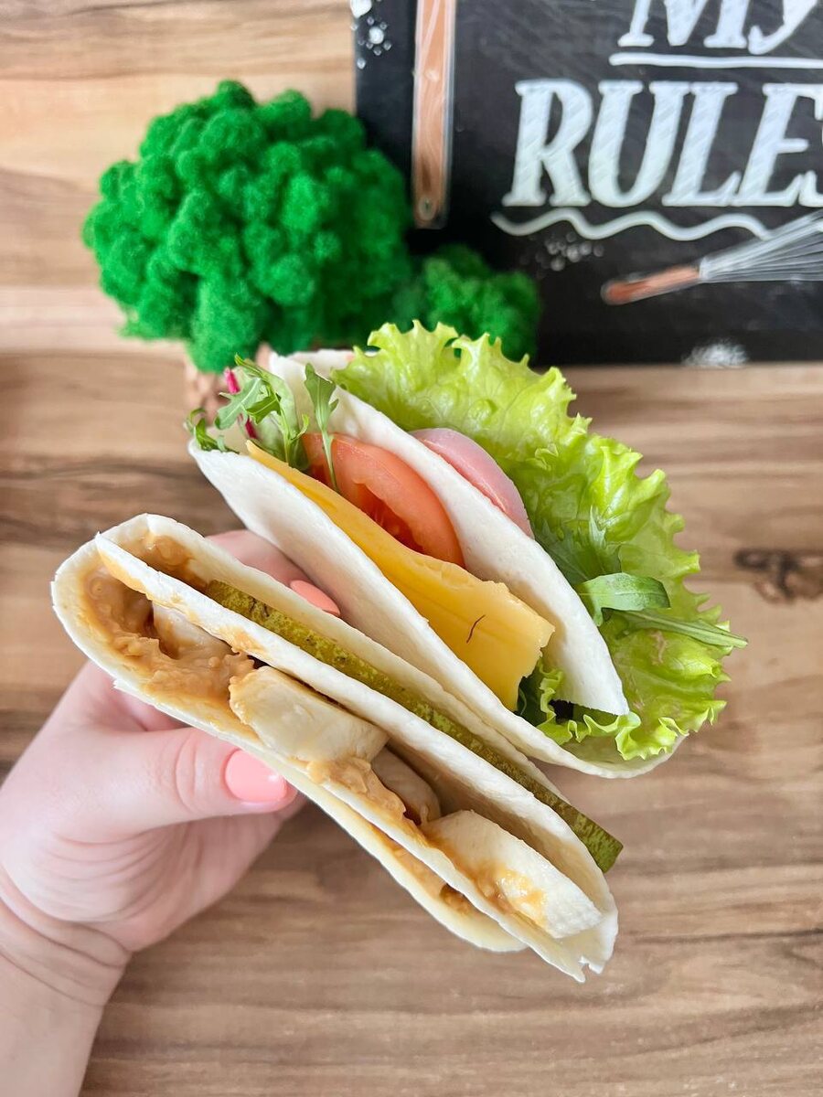 😋 1️⃣АЛЯ БУРГЕР ✅Лаваш - 45г; ✅Куриное филе или котлета из филе без муки - 40г; ✅Помидор - 30г; ✅Огурец свежий или соленый - 30г; ✅Сыр плавленый 1 ломтик - 20г; ✅Листья салата; ✅Соус: томатная паста 10г + сметана 10% 20г + соль, специи. ❗️КБЖУ на всю порцию: 259 ккал/19.8/8/27.1. 2️⃣С ВЕТЧИНОЙ И СЫРОМ ✅Лаваш - 45г; ✅Ветчина из индейки - 30г; ✅Сыр 30% - 30г; ✅Микс зелени; ✅Помидор - 30г; ✅Соус: томатная паста 10г + сметана 10% 20г + соль, специи. ❗️КБЖУ на всю порцию: 236 ккал/17/7.3/26.5. 3️⃣С АРАХИСОВОЙ ПАСТОЙ И ФРУКТАМИ ✅Лаваш - 45г; ✅Банан - 40г; ✅Груша - 30г; ✅Арахисовая паста без сахара - 40г. ❗️КБЖУ на всю порцию: 369 ккал/13.9/18.1/36. 4️⃣С АВОКАДО И СЛАБОСОЛЕНОЙ РЫБКОЙ ✅Лаваш - 45г; ✅Авокадо - 50г; ✅Слабосоленая рыба - 50г; ✅Сыр легкий - 30г; ✅Яйцо - 1шт; ✅Творожный сыр - 40г; ✅Листья салата; ✅Соль, сухой чеснок, сок лимона - для авокадо. ❗️КБЖУ на всю порцию: 495 ккал/28.7/30.4/28.4.