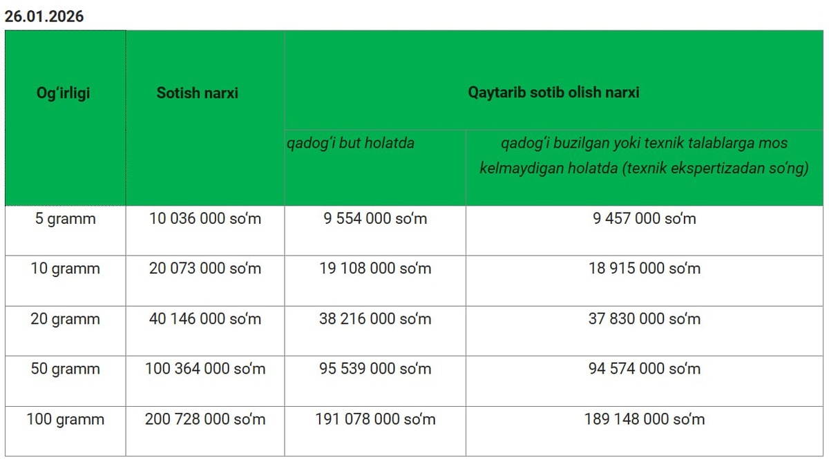 Markaziy bank 26-yanvar kuni quymalarni sotish va sotib olish narxlarini e’lon qildi. Quymalar narxi rekord darajada oshdi.