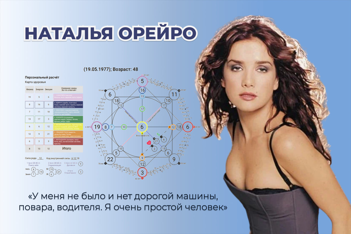 Кумир детей 90х — она была первой любовью, мечтой и образцом женственности: Милагрос из «Дикого ангела». Про которую сейчас пишут: в детстве чуть ли не трусы покупала с ее изображением)) Наталия Орейро (19 мая 1977 года) — уругвайская, аргентинская и российская актриса, певица и модель. И на этот раз мы погрузимся в разбор, следуя по тонким нитям одного из её откровенных интервью. В центре диаграммы и в финансах — 6 энергия. Люди весьма любвеобильные и милые, они пришли в этот мир создавать гармонию в в окружающем пространстве. Орейро создаёт впечатление именно такого человека. Она действительно любит всё красивое и комфортное. В жизни простая, но если на красную дорожку — то всё самое лучшее на себя. Единственное люксовое желание — комфортное путешествие. Об отношениях она говорит, что: «Есть люди, которым повезло найти одну любовь на всю жизнь... Важно не оставаться там, где вы несчастны» Об отношениях с бывшим мужем — «Мы отличные бывшие». Умеет шить, делать выкройки и в 12 лет шила