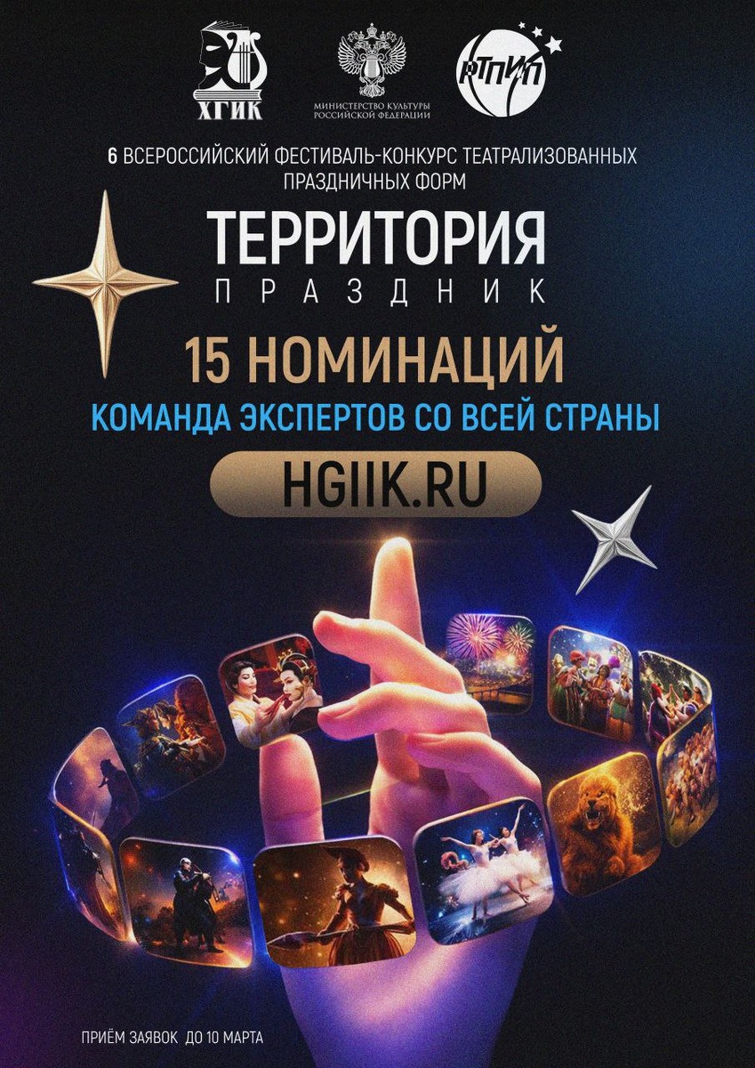 ! Приглашаем вас к участию в VI Всероссийском (с международным участием) фестивале-конкурсе театрализованных праздничных форм "Территория Праздник"! Это уникальное событие состоится с 10 марта по 10 апреля 2026 года. На фестивале представлено 15 уникальных номинаций — от авторских театрализованных представлений разных жанров до ярких праздников. Этот конкурс — не просто возможность заявить о себе, но и шанс познакомиться с единомышленниками, обсудить актуальные тенденции в сфере праздников и театрализованных форм. Кто может участвовать? Приглашаем принять участие режиссёров театрализованных представлений и праздников, организаторов, творческие команды культурных учреждений и всех тех, кто неравнодушен к созданию праздничных событий! Всю информацию вы можете узнать на сайте ХГИК: hgiik.ru/kafedra-rtpip/festival-konkurs-territoriya-prazdnika. С нетерпением ждем ваших заявок и верим, что "Территория Праздник" станет площадкой для реализации ваших самых смелых идей! 🥳 «Территория пр