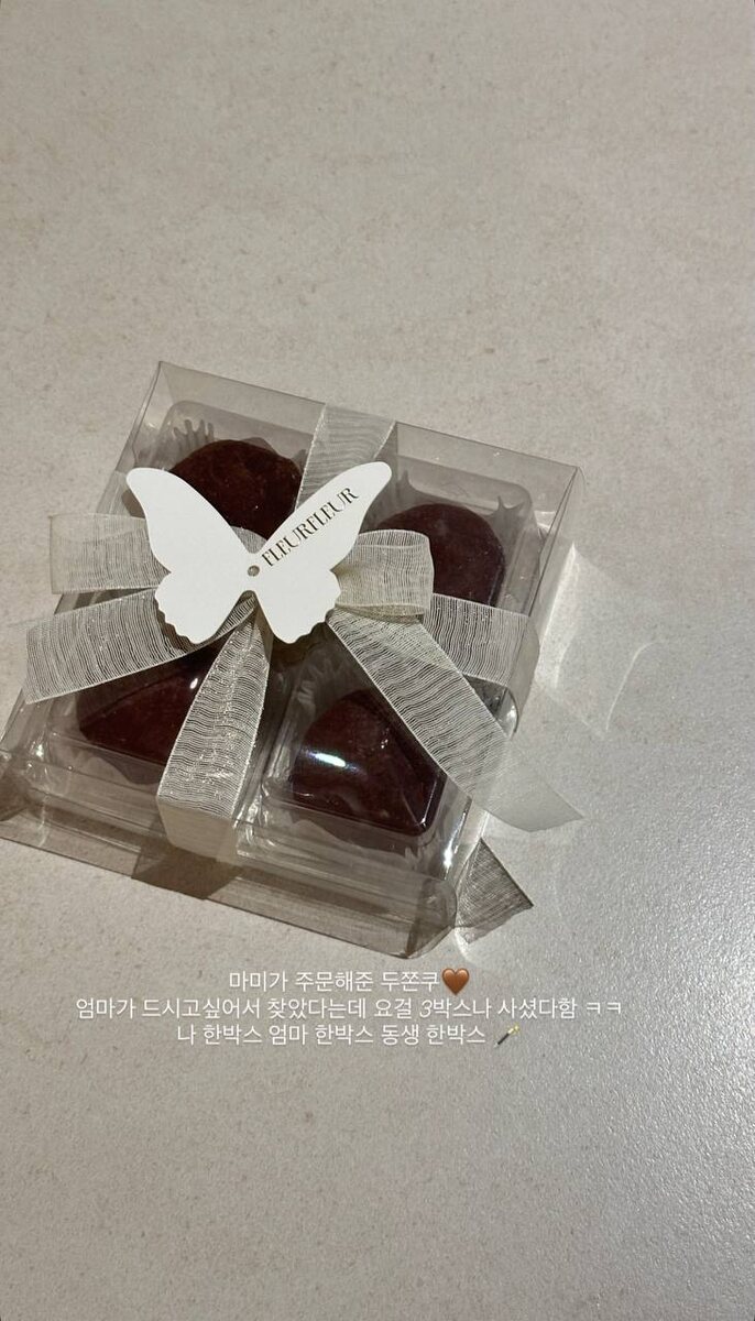 : Дучжонгу от мамы 🤎 Она специально пошла искать эти печеньки, ей очень захотелось их попробовать. А когда нашла, купила сразу три коробки, ха-ха. По одной мне, маме и младшему брату 🪄 * Дучжонгу - липкие печенья из Дубая - новый бум и тренд десертов в Сеуле, которые невозможно купить без очереди. Этот десерт, вдохновленный дубайским шоколадом, состоит из хрустящей вермишели кадаиф и тертого фисташкового ореха, обернутых в липкую основу и запеченных в форме печенья. #JHOPE @kumihobts