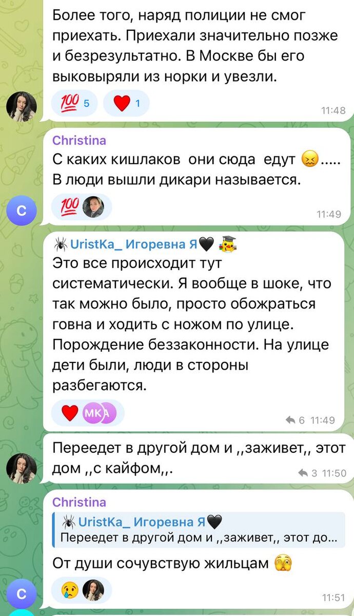 Говорят, что конфликта никакого не было, просто обдолбанный семьянин выбежал из подъезда с криками «Кого бы зарезать, чтобы сесть». Местные жители утверждают, что избежать резни удалось только благодаря прохожим. Сообщают, что была вызвана полиция, но его не задержали. В комментариях пишут, что надеяться можно только на «Русскую общину». Почему так? "Многонационал" Сальное Дифлопэ