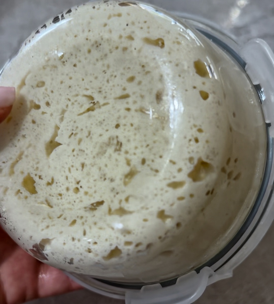 - Берём закваску на пике активности (удвоилась–утроилась, пузырится, приятный запах, вкус яркий, но не перекисший).
