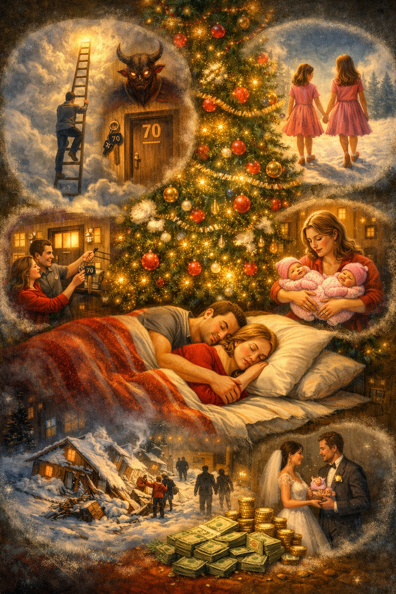 С женой у нас появилась необычная традиция. Каждое 31 декабря мы устраиваем постель прямо под ёлкой и засыпаем там. Звучит странно, правда? Но за несколько лет мы убедились: то, что снится нам в эту ночь, обязательно сбывается. Всё началось несколько лет назад. Я уснул под ёлкой и увидел яркий сон. Ко мне с потолка спустилась длинная лестница, и чей-то голос спросил: — Тебе наверх или вниз? Я, конечно, полез наверх. Поднявшись на определённую высоту, услышал тот же голос: — Остановись здесь. Ключи под ковриком. Твой номер — 70. Я нашёл ключи и пошёл по коридору, пока не остановился у двери с номером 70. Ключ подошёл идеально. Когда я вошёл внутрь, на столе стояли наши семейные фотографии. Утром я рассказал жене об этом сне. — Такое только в сказках бывает, — усмехнулась она. Той зимой выпало столько снега, сколько я не помню за всю жизнь. В два часа ночи у нашего дома рухнула крыша под тяжестью сугробов. Все жильцы выскочили на улицу в чём были. Приехал глава города и объявил, что нас