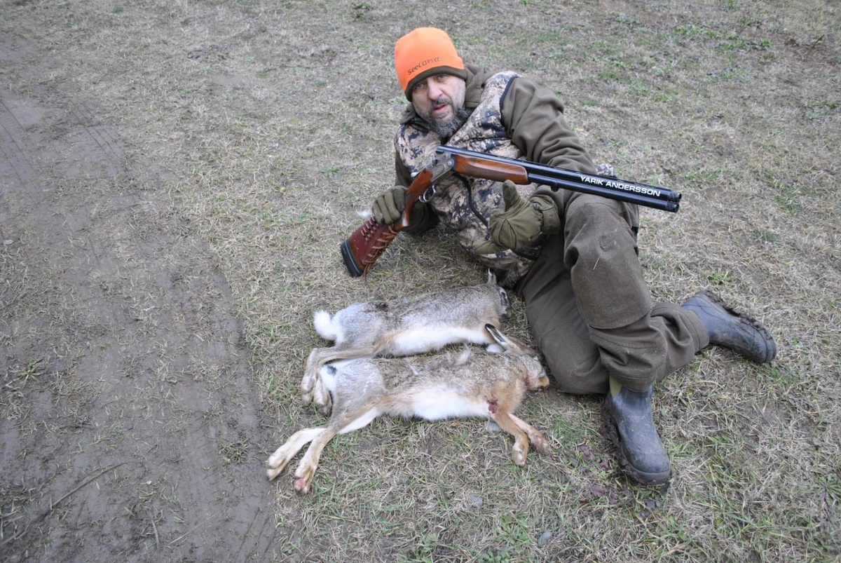 Архивное фото -охота на зайца с ружьем 12 калибра патрон самокрут №2 32 гр на картонном контейнере