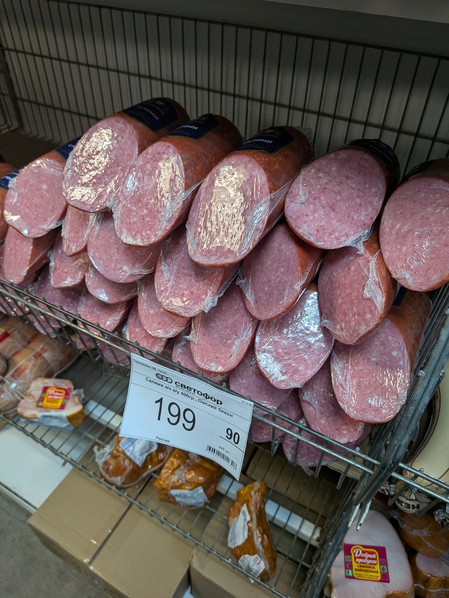 Салями продавали от "Омский бекон", их же колбасы я приобретаю время от времени в супермаркете около дома, не припоминаю, чтобы домашним они не понравились по вкусу. К слову, в "Светофоре" цена-то не супер низкая, эта колбаса отличалась на фоне других в магазине, ее как раз не продавали за копейки, она обойдется в 199 рублей за 400 гр.