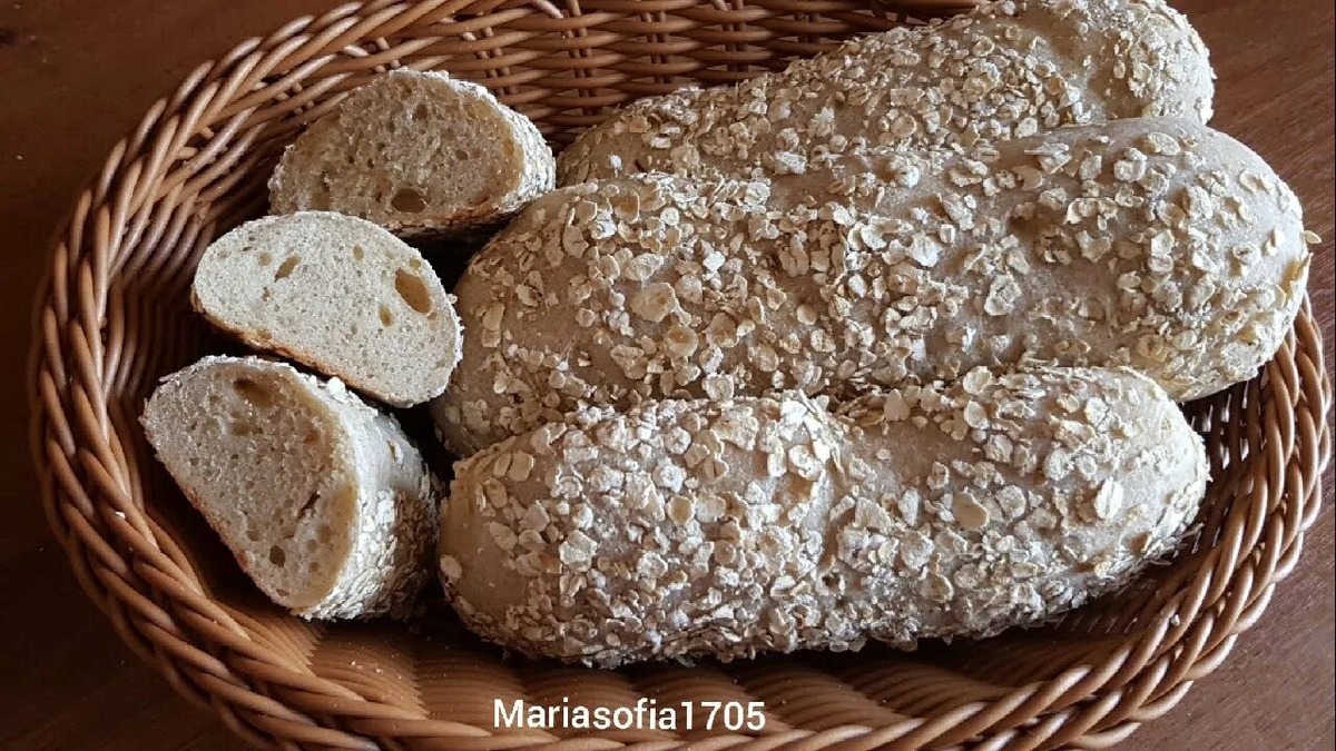 Рецепт овсяных багетов, приготовленных в домашних условиях. С хрустящей корочкой, нежным, сочным и крупнопористым мякишем. Вкусный домашний хлеб у вас на столе! Для приготовления домашних багетов я использую пшеничную муку высшего сорта. Овсяные хлопья - обычный Геркулес, который нужно варить. Оливковое масло можно смело заменить любым другим растительным, а сахарный песок - патокой или натуральным медом.Дрожжи для домашних багетов по этому рецепту - быстродействующие. Их не нужно предварительно будить в жидкости (смешиваем сразу с мукой). Правда, получатся овсяные багеты как с сухими дрожжами (такоеже количество), так и прессованными (берем в 3 раза больше, то есть граммов 9-10).Такие дрожжи растворяются в стакане теплой воды с добавлением сахара (патоки, меда) и оставляются при комнатной температуре минут на 10-15. За это время дрожжевой коктейль начинает пениться - дрожжи просыпаются и готовы работать дальше.Всего из указанного в рецепте количества продуктов получается 4 довольно кр