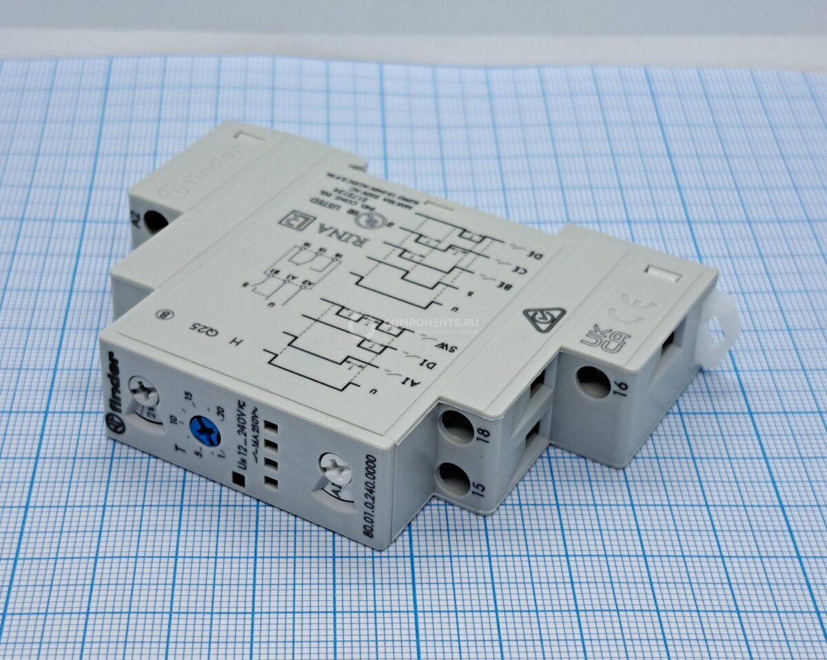 FINDER 80.01.0.240.0000 — модульный электромеханический таймер для точного управления временными интервалами в электрических цепях. Устройство сочетает простоту аналоговой настройки с надёжностью промышленного исполнения. 1. Универсальность питания: работает от 12 В до 240 В (AC/DC). 2. Высокая нагрузочная способность: коммутирует до 16 А. 3. Многорежимность: 6 программ работы для разных сценариев автоматизации. 4. Широкий диапазон времени: от 0,1 секунды до 24 часов. 5. Прочность: 100 000 циклов переключения при номинальной нагрузке. 6. Удобство монтажа: стандарт DIN‑рейки (35 мм). Временные параметры: 7. Степень защиты: IP20. Режимы работы (6 вариантов): - AI (задержка включения). Контакт замыкается через заданное время после подачи питания. Сброс при отключении питания; - DI (интервалы). Контакт замыкается сразу при подаче питания. Размыкается через заданный интервал; - SW (симметричный цикл). Чередование «ВКЛ»/«ВЫКЛ» с соотношением 1:1. Работает до отключения питания; - BE (задержк