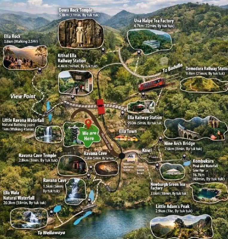 ✨Уютный городок в центре Острова. Удобное место для остановки , до всех достопримечательностей 5-15 минут на тук туке. 💨Что посмотреть рядом: • Ella Rock — подъём с панорамами на долины • Little Adam’s Peak — лёгкий маршрут с красивыми видами • Мост Девяти арок — старый ж/д мост среди джунглей • Вокзалы Элла и Китал Элла — часть живописной железной дороги • Водопад Равана и пещера Раваны • Маленький Равана и водопад Ella Wala • Скальный храм Дова • Пещерный храм Раваны • Чайные фабрики Uva Halpe и Newburgh • Ella View Point • Железнодорожная петля Демодара • Природный бассейн и водопад Комбукара (Сера Элла) Шри Ланка с любовью