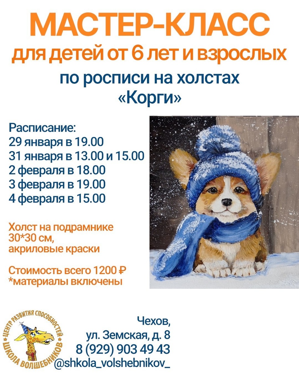 ✨ МАСТЕР-КЛАСС «Корги»🐶 Напишем очень красивую картину с очаровательным корги🐶на холсте акриловыми красками🎨Такую работу можно повесить дома и подарить своим близким в качестве подарка🎁 А также проведем отлично время в приятной компании🙂 Ждём Вас! 📅29 января 🕖19.00 31 января 🕐13.00 и 15.00 2 февраля🕕18.00 3 февраля🕖19.00 4 февраля🕒15.00 💻https://vk.com/volshebnikiclub 🚫 Возраст: 6+ 🏢 Центр Развития "ШКОЛА ВОЛШЕБНИКОВ" 📍 г.Чехов, микрорайон Губернский, ул.Земская, д.8 🔗 Записаться: https://wa.me/+79299034943 ⭐Поддержать канал голосом #детямЧехов #интересноЧехов ✅ Мероприятия Чехов https://dzen.ru/id/66cc4b48e9ef144699238a51 http://vk.com/chekhov_events http://dzen.ru/chekhov_events