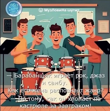 😄 МузЛовиНа (https://vk.ru/club234057279) шутит — Барабанщик играет рок, джаз и самбу. Как его жена распознаёт жанр? — По тому, как он хлопает по кастрюле за завтраком! Видео: https://vk.ru/video-234057279_456239077