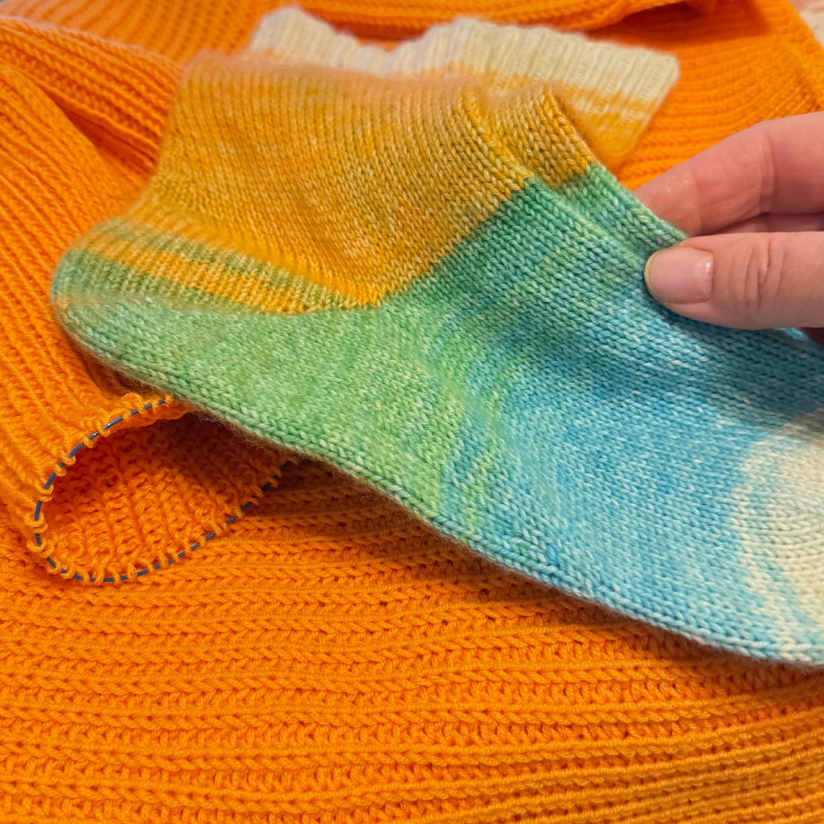 Этот процесс вы видите последний раз. Не потому, что проект будет распущен, конечно. Потому, что сегодня-завтра он перейдет из разряда процессов в разряд готовых работ. Осталось совсем немножко, 25 рядов рукава и 15 рядов резинки манжеты. На фотографии на "Мандаринке" пристроилась еще одна готовая работа января - носочки из Wave. Это уже третья пара носочков из этой пряжи. Очень понравилась! И расцветки интересные, и по ощущениям пряжа замечательная! Но вернемся к джемперу. Сложный процесс. Полупатентная резинка так и норовила преподнести сюрпризы, но к огромной моей радости, с расчетами я не ошиблась - удалось просчитать растяжение полотна. Второй рукав вяжется намного быстрее: никаких неожиданностей, никаких переживаний, вяжут свои двести рядов, точно зная, что результат будет таким, как я и жду. Несмотря на то, что пряжа - гребенной меринос, в резинке она ведет себя как кардная: резинку не держит, она расползлась после стирки. Я даже сомневаться начала, пошла искать информацию о не